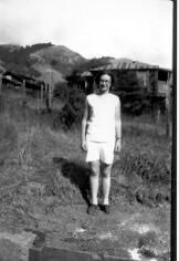 This black and white photo is of a yung woman standing on a hillside with a house behind her and mountains in the background. She is wearing white shorts, a sleeveless white top and white knee socks. She has dark hair and is wearing glasses.Collection