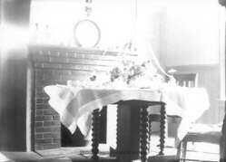 This black and white photograph of the interior of a home centers on a table set for a party. It is hard to distinguish what exactly is on the table as the photo is washed out and fuzzy but there is a tablecloth and what appear to be streamers hanging down from above the center of the table and going out to the sides. There is a fireplace behind the table with a round plate or mirror on the mantel.Collection