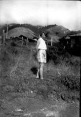 This black and white photo is of a young womanstanding on a hillside. She is standing sideways to the camera with her head turned toward it. She is wearing print shorts and a white top and has short dark hair. There are two houses in the background with hills rising behind them. The sky is overcast.Collection