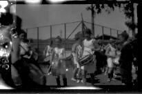 This too dark black and white photograph shows some girls with marching drums standing roughly in lines. They are dressed similarly in light colored sleeveless dresses. There is a high fence (such as surrounds a playing field) in the background. These individuals are unidentified - possibly a school marching drum corps?Collection