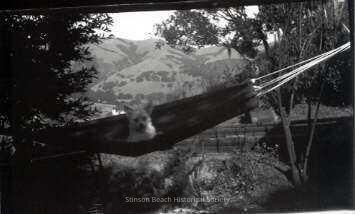 Cute fluffy white dog looks out at the world from a hammock strung between trees with Mt. Tamalpais ridge in the background.Collection