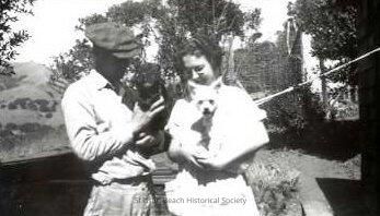 A couple holding their pet dogs. The man in a cap holds a small black dog and the woman cradles a fluffy white dog in her arms. They are standing outdoors, possibly in the yard of their house with Mt. Tam hillside in background as well as some nearby trees.Collection