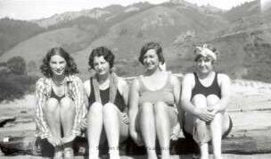 Four young woman sit abreast on a log on Stinson Beach with Mt. Tamalpais rising behind them. They are all in swimsuits of the day.Collection