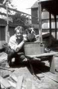A light-haired man kneels beside his black & white dog who is sitting in a washtub on top of a bench/table. They are in an enclosed area outside of a house. There is some lumber on the ground in front of them.Collection