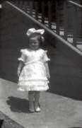 Young girl in a lacy white dress and big bow in her hair poses beside an outdoor staircase. Gives the impression it is her Sunday best and she is going to her first communion or baptism.Collection