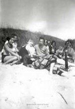 Mixed group of men and women, casually attired, some with bathing caps, sit on the beach in front of dune grasses.Collection