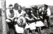 Six people - 4 women in the center flanked by a man at either end, one of whom holds a black dog - lean over a wooden rail facing the camera. Two women wear large-brimmed hats and another is holding hers, which is a bit fancier with flowers on the brim.Collection