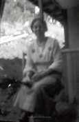 Woman in V-necked blouse and longish skirt sits on a stool on the porch of a house facing the camera. Photo is rather blurry so difficult to tell age of woman.Collection