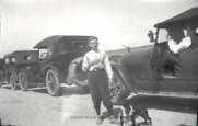 A man stands in front of a parade of vintage automobiles. He has a black and white dog on a leash. He is wearing black knickers, light shirt, white tie. The driver is visible in the last vehicle in line, which is the one the man is standing beside.Collection