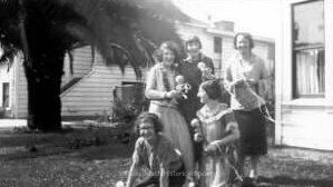 This black and white print is of five smiling women. Two are kneeling on the ground in front of three who are standing. They all are holding what appears to be a small bouquet with a pompom type flower in the center and long trailing ribbons. There is a large tree behind them on the left and houses in the background. The women are unidentified.Collection