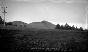 This black and white photo was taken somewhere on Mount Tamalpais. The foreground is a level surface beyond which the tops of mountains rise. There is a line of telephone posts and wires at the left of the photograph and trees on the left and right rising from below the foreground surface. Behind the trees and hills at the right of the picture a fog bank (most likely over the ocean) is visible.Collection