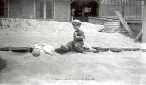 A small boy sits on a boardwalk on the beach in front of a wooden house with an ice cream (or something edible) in his hand. He is wearing overalls and a soft cap.Collection