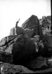 In this black and white photo a woman stands on a large boulder amongst lots of boulders. She stands with her hands together over her head in diving position although there is no water visible beneath her rock platform.Collection