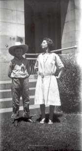 A young boy and older girl stand on the lawn in front of some steps with iron railing. He is dressed in a cowboy hat, kerchief around his neck, long-sleeve shirt and jeans and stands with his hands behind his back. The girl has short bobbed hair and is wearing a shirtwaist dress with a thin necklace. She also has her arms behind her and is looking off to the side over the head the the boy.Collection