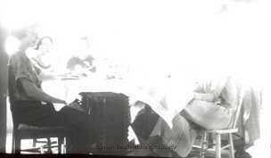 Photo is extremely washed out. Several women sitting around a table with a white tablecloth are barely visible.Collection