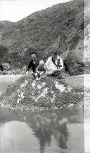 On a large lichen-covered rock, possibly at the end of Stinson Beach, sit a man, woman and tow-headed toddler. The woman who is looking down at the child is wearing a white blouse with a dark scarf knotted mitty-style hanging from her neck and holding a hat. The man, in dark shirt and cap, stands behind the rock with hands resting on it smiling at the camera. The hill rises up behind them.Collection