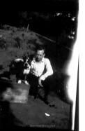 In this black and white photograph a man is resting on one knee beside a low wall on which a boston bull terrier stands. The dog is looking at the camera. The man is looking at the dog.Collection