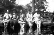 This black and white photograph is of five ladies sitting on a low wall dangling their feet into a pool below. All are wearing dresses. Three are bareheaded and two wear brimmed hats. They are all looking at the camera and smiling. There are trees in the backgroundCollection