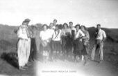 In this black and white photograph 13 young people stand in a semicircle facing the camera. Three girls in the middle are wearing middy tops, dark skirts and knee socks. They are all standing on open ground on a hillside.Collection