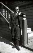 A middle-age man in a dark suit with vest and tie stands at the bottom of an outdoor wooden staircase facing the camera with his arm resting on the stairpost. He is slender and has a bushy moustache.Collection