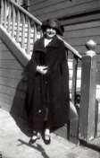 A woman in a black cape/coat with a wide collar and black broad-brimmed straw hat and patent leather slippers/shoes stands beside the now familiar outdoor wooden staircase. She is smiling at the camera and holds her coat closed with one hand.Collection