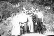 Although photo is washed out, one can make out a group of 11 people clustered together for a group photograph outdoors. They seem a happy bunch, some with arms around each other. They are standing is a clearing amongst scrubby bushes.Collection