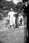 This black and white photograph depicts the same woman on the same rooftop as is in #1999-315-K-01. She is in a slightly different position with one arm out away from her side and the other resting on the top of the chimney. The same people are on the ground below her in the gackground.Collection