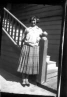 This black and white photograph is of a young woman in a blouse and plaid, pleated skirt. She stands at the foot of a staircase (which is the background for several other photographs in this series).Collection