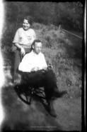 In this black and white photograph a man is sitting in a rocking chair. He wears dark trousers and a white shirt. His knees are crossed and he holds a cigar in one hand. A woman in a light blouse and dark skirt stands behind him with her arms resting on the back of his chair.. They are in a garden.Collection