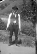 This black and white photograph shows a man standing facing the camera. he is wearing dark trousers, a white shirt, a dark vest and necktie and a fedora. He holds a horse shoe in his right hand and a cigarette in his left. There are a tree, shrubs and a mountainside in the background.Collection