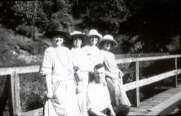 Four women in wide brimmed hats and longish dresses stand along a railing that could be part of a wooden bridge. Sitting down in front of them is a young man in a white shirt. All are looking toward the camera. There is a hillside behind them with dense foliage covering rock.Collection