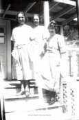 Three women in shirtwaist dresses stand in a row on porch stairs. They are all looking towards the camera and smiling. It is a sunny day.Collection