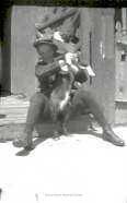 More a teenage boy than a man sits on a wooden step of a building with his arms around around his dog (a black and white boxer-type), holding him up in a standing pose. The dog is stretching back to lick the face of the boy. The boy wears a cap and tight trousers.Collection