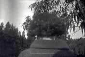 Photo of the back of woman's head who is facing forward in photo 1999-317C. She has a curly bob. Eucalyptus branches and tops of pine trees decorate the background.Collection
