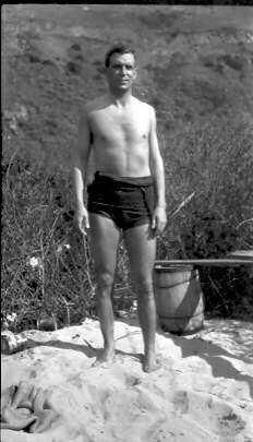 This black and white photograph shows a man standing on a patch of sand. He faces the camera with his arms hanging to his sides. He is wearing a bathing suit with the top pulled down exposing his chest. There is a small barrel behind him, supporting a board and rough grass and shrubbery in the background.Collection