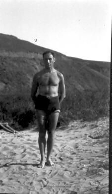 In this black and white photograph a man in a bathing suit stands facing the camera with his hands behind him and the top of his suit pulled down exposing his chest. He stands on a dune and Highway One is visible behind him.Collection