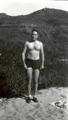 Unidentified man in dark bathing trunks, shoes and gym socks, stands in the sand in front of a bramble bush with the mountain rising up behind him. He looks directly at the camera with his arms straight down at his sides. A rumpled beach towel is on the sand off to the side of himCollection