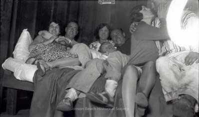 Three obvious couples and maybe one odd man out sit on a bed or bunk against the wall of a house at (probably) 40 Buena Vista. The group is probably the "Anchorage Gang." The couple on the left - he has his arm draped around her neck. They're both smiling. Smiling couple in the middle (he has his head resting on her shoulder) have another man's head cradled in their lap. Couple on the right a getting ready for a smooch.Collection