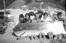 In this black and white photo seven people (four women and three men) sit behind a surf board which is painted like a shark, holding it on their laps with their feet sticking out in front. The man second from the right is turned on his stomach, looking over his shoulder at the camera so his feet show upside down under the shark. They are all grinning at the camera. They are sitting on a dune with mountains in the background. A man is visible on the left side of the photo sitting and looking toward his lap.Collection