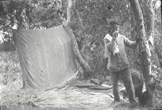 A young man in sweater and long pants with a white towel draped over his shoulder stands by a tree in a campsite in the woods. He has one hand on the trunk of the tree and is holding to his mouth in his other either a toothbrush or a cigarette. To the side of him, a blanket hangs to the ground over a line strung between the trees. There are other blankets spread on the ground.Collection