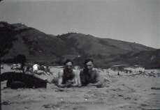 Two young men lie on the sand facing the camera. Beyond them on the left are a few other people on the beach, and a white bathroom-looking building in the distance on the right. The hills of Mt. Tamalpais form a backdrop. The sky is clear.Collection