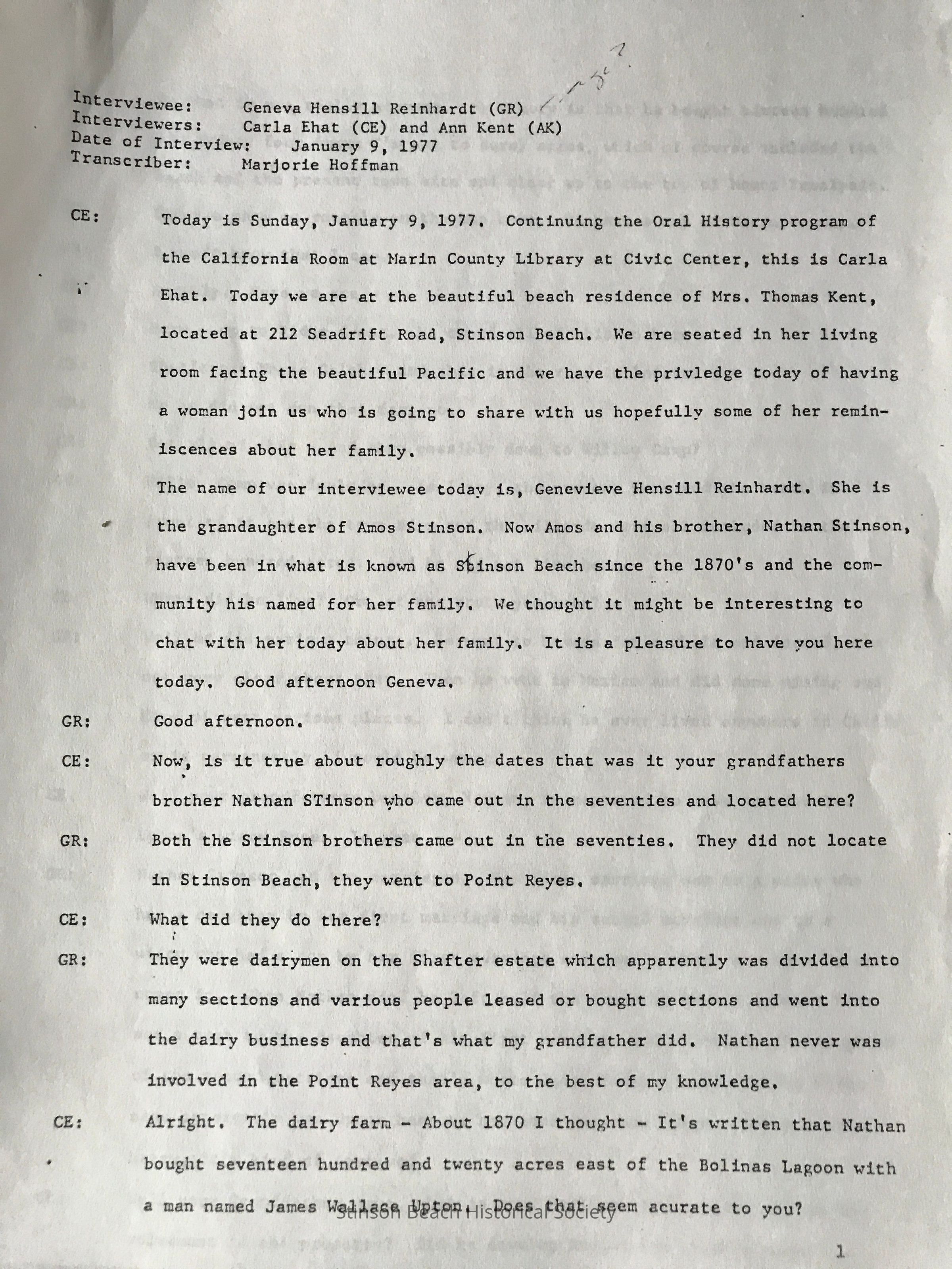 Geneva remembers Stinson Beach from the 1940's through 1970's. She is the granddaughter of Amos Stinson.