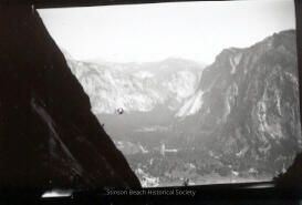 Panoramic view of some rugged mountains which appears to be taken from a window, perhaps from a train.Collection