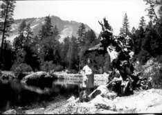 In this black and white photograph a woman stands at the edge of a lake by the remains of a huge tree stump which towers 6 or 7 feet above her. There are conifers bordering the shoreline behind her with a craggy mountain in the background. It appears to be somewhere in the Sierra.Collection