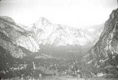 Panoramic view of craggy mountains rising on three sides above a valley. The mountain in the center is quite majestic. The valley below is mostly densely forested with trees.Collection