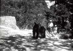 A small black bear walks along an open trail and is watched by a man and a woman who seem to have come upon him unexpectedly.Collection