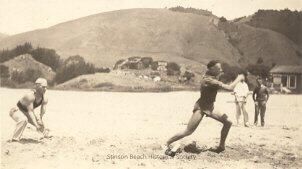A continuation of the previous photo (1999-321) where the batter seems to have hit the ball and is commencing to run.Collection