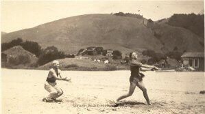 Same subject as previous photos (1999-321 & 322) but different batter in shorts and t-shirt. He appears to have just completed a swing of the bat. The batter is standing with knees bent and arms outstretched in front of him. Hills with structures prominent in the background.Collection