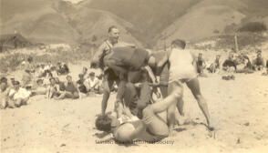 This black and white photograph (discolored by age) is of a tangle of men in beach wear, some down but most standing pushing against one another on the beach. From their positions it appears they are playing rugby, not football. The photograph seems to be of the same game depicted in #1999-324. There are many spectators (upwards of 25), all in beach garb, seated on the sand behind the players.Collection