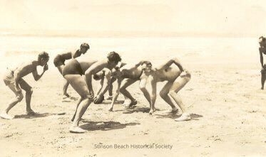 This black and white photograph (yellowed by age) shows six men lined up, three to a side, at a scrimmage line. They are on the beach with the water line in the background. There is another man partially visible at the far right of the picture waiting to catch the ball which is in possession of the men on the right side of the scrimmage line.Collection